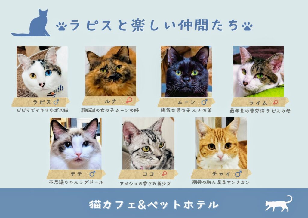 現在は、元保護猫(しろ2・くろ1・さび1)4匹と、ブリーダー育ちで血統書付きのアメリカンショートヘア♀と、ラグドール♂、マンチカン♂の、計7匹の猫スタッフで、皆様に楽しんで頂けるように工夫し、猫じゃらしや、猫おやつ(百円)などもご用意しています。ただ、愛情深くお世話してきましたが、元保護猫については、まだ人馴れがじゅうぶんでない子もいます。どうか温かい声掛けをしていただき見守っていただけると、猫たちも安心して愛らしいお顔を見せてくれると思います。